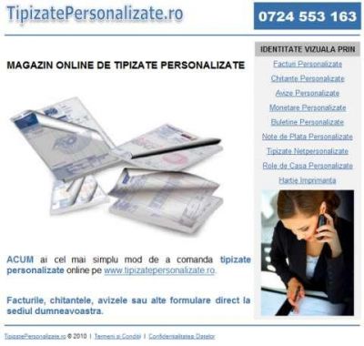 Acum doar cu un simplu click puteti comanda tot ceea ce va este necesar in materie de tipizate personalizate.Facturi fiscale personalizate,chitante personalizate cu sigla firmei dumneavoastra,avize de expeditie a marfii personalizate cu sigla firmei.Tot ceea ce aveti de facut este sa comandati online sau sa ne sunati,suntem oricand la dispozitia clientilor.Va asteptam pe site-ul nostru www.tipizatepersonalizate.ro unde puteti vizualiza produsele dorite.Comanda online Tipizate personalizate, facturi tipizate, chitante personalizate, facturi personalizate, avize personaliate, documente personalizate, livram orinde in tara prin curier rapid.Ne puteti contacta telefonic la 0768069555.