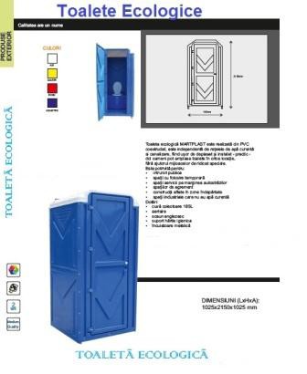 - Produse Composite va ofera Toalete Ecologice realizate din pvc coextrudat de inalta calitate. Dimensiuni: 1025x 2150x 1025. Dotari: cuva colectoare cu volum de 185L; scaun sezut cu capac; suport pentru hartie igienica; usa prevazuta cu sistem de inchidere. Este independenta de retelele de apa curenta si canalizare, fiind usor de realizat, montat fara ajutorul utilajelor de ridicat. Este creata pentru folosinta in spatiile destinate intrunirilor publice cu multi participanti (intalniri socio- culturale, evenimente sportive, concerte, parcuri, santiere etc.). Made in Produse Composite.