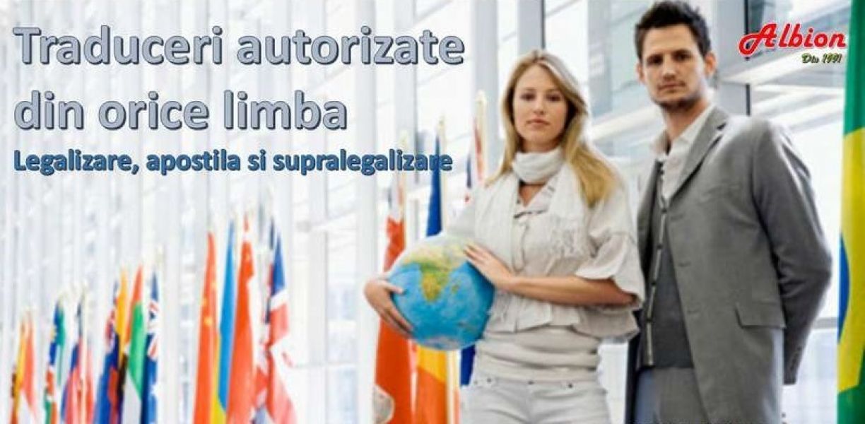 - Albion va pune la dispozitie o gama larga de servicii, precum: traduceri autorizate si legalizate, aplicare apostile (atat pe documentele originale cat si pe traducerile acestora), supralegalizare, interpretariat. Contact: str. Putul lui Zamfir nr. 26, sect. 1, București. Tel: 021.230.00.71, 0722.341.026 si NON STOP la 0724.334.580; mail: albion@albion.ro