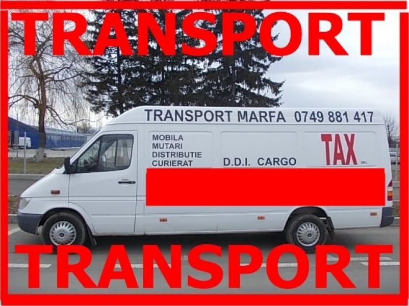 - Transport marfa, mobila, mutari, distributie, curierat, diverse colaborari, disponibilitate contracte, cu autoutilitara Mercedes Sprinter Maxi in conditii optime si LEGALE. Dimensiuni duba: L - 4, 2 m, h - 2 m, l - 1, 8 m. PRETURI MINIME, inclusiv factura. Tel: 0749881417 sau 0756337735.
