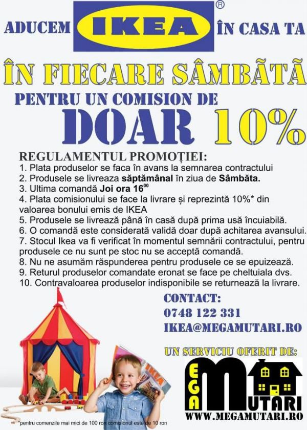 - Megamutari aduce Ikea la tine acasa, alege produsele preferate de pe Ikea.ro trimite-ne codurile lor la adresa ikea@megamutari.ro si noi ti le aducem de la Bucuresti pentru un comision de doar 10%. Livrarea produselor se face in fiecare sambata!