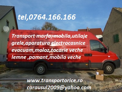- TRANSPORT, acces oriunde suntem in orice locatie din Buc. in maxim o ora, masina va fi la dumneavoastra, transport marfa, mutari mobilier din apartamente 1, 2, 3, 4, 5 camere cu personal pt. incarcare, descarcare, demontare, montare,