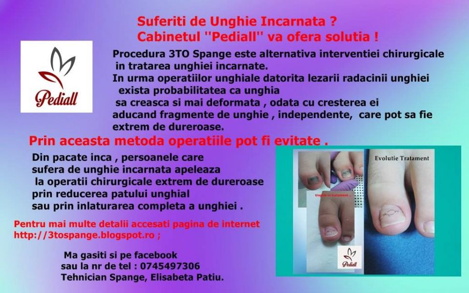 - Procedura 3TO Spange este alternativa interventiei chirurgicale in tratarea unghiei incarnate.Tratamentul 3TO Spange pentru unghiile incarnate exista de peste 10 ani in Romania si reprezinta un sistem de invatare a unghiei sa creasca drept pe patul unghial cu ajutorul unei proteze de sarmulite similara aparatului dentar. In Germania, aceasta tehnica este recunoscuta atat de specialisti cat si de pacienti rezolvand 97% din cazuri . Este o tehnica nedureroasa si este recomandata la toate grupele de varsta inclusiv persoanelor care sufera de diabet zaharat.