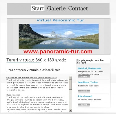 Realizam tururi virtuale 360 x 180 de grade, care se pot posta pe site-ul fiecarei firme. Se preteaza orice fel de activitate comerciala: restaurante, baruri, hoteluri, cabinete medicale, clinici, gradinite, saloane de infrumusetare, institutii de cultura, de invatamant, sedii de firme, locuinte, apartamente, etc. Pret sub pretul pietei. Se ofera comision pentru orice tur virtual adus.