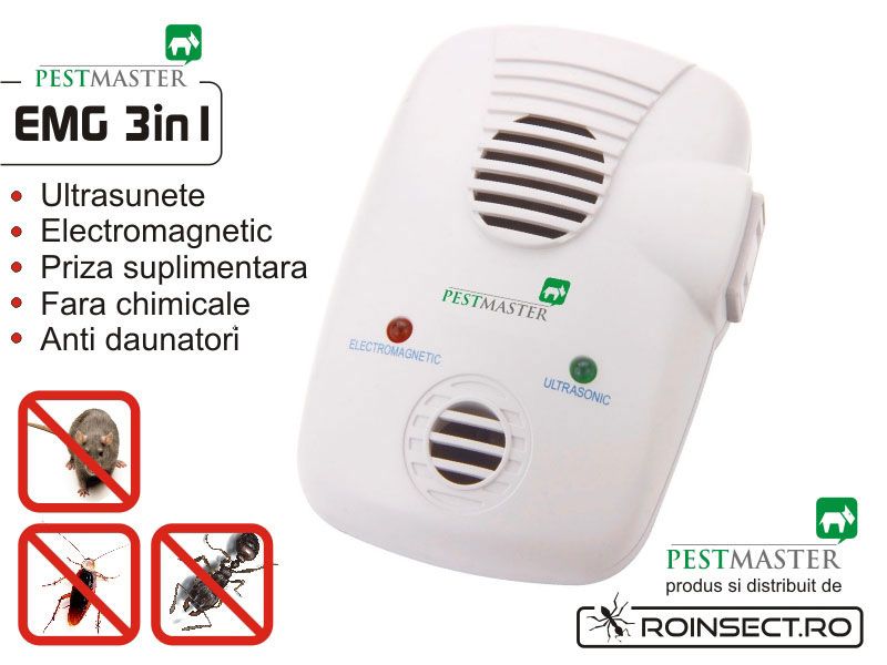 Pestmaster EMG3IN 1 este un aparat ce combina ultrasunetele cu emiterea impulsurilor electromagnetice si se bazeaza pe sensibilitatea daunatorilor.Comenzi la numarul de telefon :0758101503 sau http://www.roinsect.ro/ -