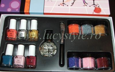 Intr-o prezentare de exceptie setul are in componenta doua lacuri in culori diferite ( 5ml), 2 recipiente cu catifea foarte fina in aceeasi culoare cu lacul, un lac transparent (5ml) cu uscare rapida si o pensula pentru indepartarea prafului de catifea.