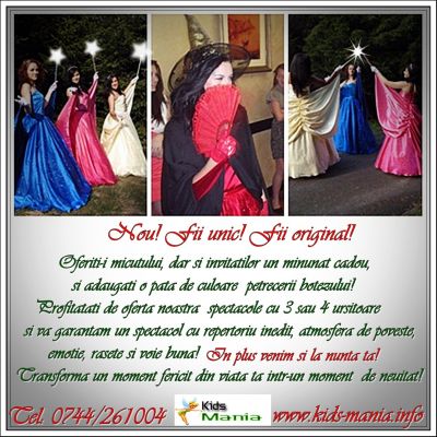 - Oferiti-i micutului, dar si invitatilor un minunat cadou, si adaugati o pata de culoare petrecerii botezului! Profitatati de oferta noastra -spectacole cu 3 sau 4 ursitoare - si va garantam un spectacol cu repertoriu inedit, atmosfera de poveste, emotie, rasete si voie buna! In plus venim si la nunta ta! Transforma un moment fericit din viata ta intr-un moment de neuitat! http://www.kids-mania.info