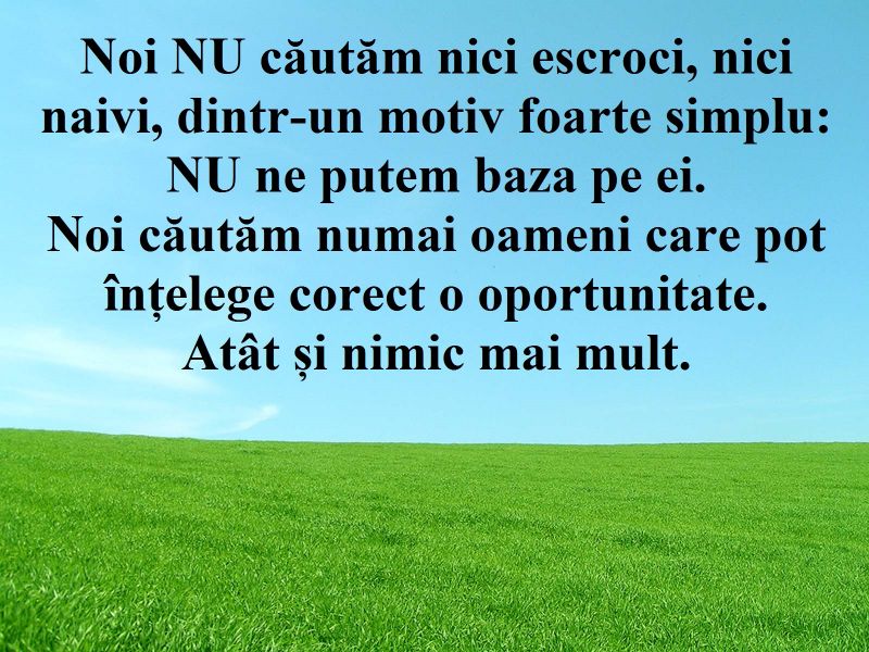 - Va oferim lucru part-time: cautam persoane capabile sa obtina chiar din prima luna rezultatele pe baza carora sa castige 1500 RON (lei noi) lunar. Oferim contract de comision care va garanteaza plata rezultatelor. Ne gasiti la adresa de email: vasileiuliu@gmail.com