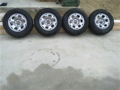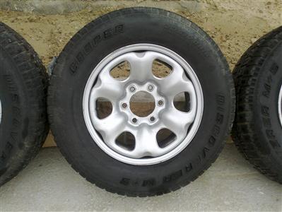 - Vand set 16 inch de 4 buc jante fond metal 6x139,7 pt 4x4 japoneze Toyota,Mitsubishi,Isuzu,Nissan,Monterey etc.Jantele sunt 7Jx16H2,cu et 25,impreuna cu anvelope Discovery Cooper 235/75/R16 At-uri de iarna cu steluta si M+S uzura 30%.Pret set jante cu anvelope 300Euro,sau doar jantele 200 Euro.
