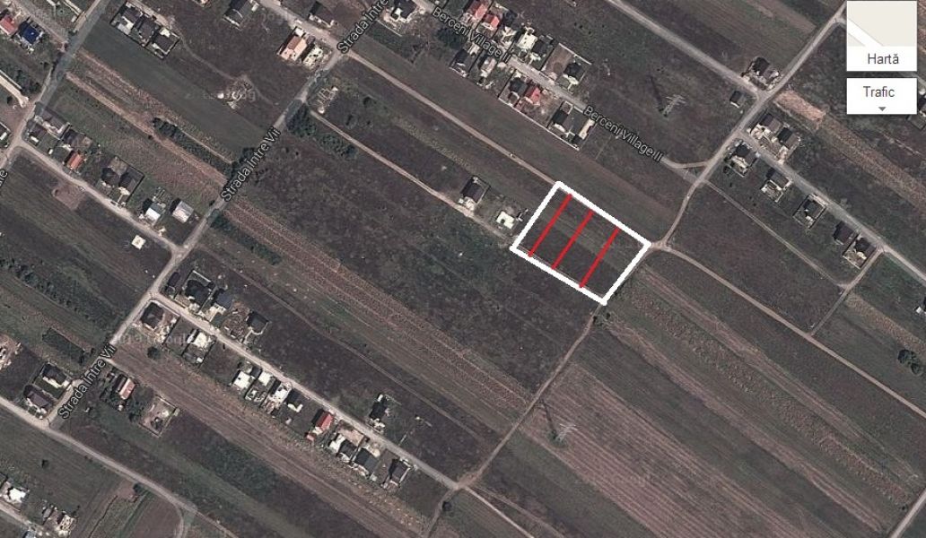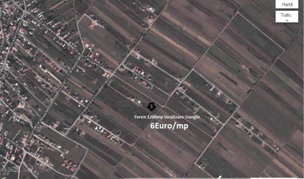 Teren intravilan cu suprafata 1200mp, cadastru si intabulare, acces la 3 drumuri de servitute, intre case, drum pietruit, pozitie centrala, curent electric in apropiere, este afectat partial (30%) de o linie de medie tensiune, pretabil constructii provizorii, garaj, depozitare etc.