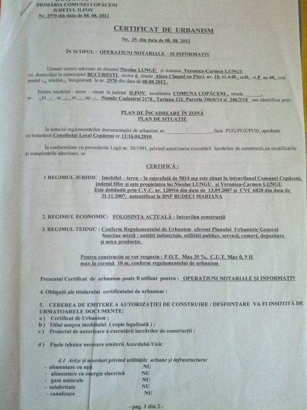 - Particular Vand Teren Zona 1Decembrie in Localitatea Copaceni Judetul Ilfov intravilan prin P.U.G.5814mp-d=30m.lotizat in 650mp-d=22;drum acces 7.5m teren dubla deschidere Functiune Mixta.C-tii civile si industriale(Case-Vile cat si Hale-Depozite-Ateliere de productie etc).Gaze,curent,la 200m(linie case comuna).Certificat Urbanism-P.O.T.=35% C.U.T.=0,9H max(la cornisa)=10m.Cadastru Intabulare.In viitorul apropiat va fi finalizata c-tia.Port.1Decembrie(Canal-Dunare Bucuresti)cu ecluza in Copaceni.Localitatea Copaceni nu este Adunatii Copaceni,sunt localitati vecine(difera judetul).Teren plat cu denumire de strada si oficiu postal pt.fiecare lot in parte-str.Bradului nr.60.Accesul la teren se face prin Str.Nucului(latime 12m).Asigur curentul la teren.Accept variante vila in ilfov.BCA,CARAMIDA,AMVIC(la cheie)ofer 4000mp.teren.C-tie vila:BCA,CARAMIDA,AMVIC pe terenul meu,ofer.maxim 3000mp.teren.Pret 15.euro.usor discutabil.Tel.0761329671,0725065443.
