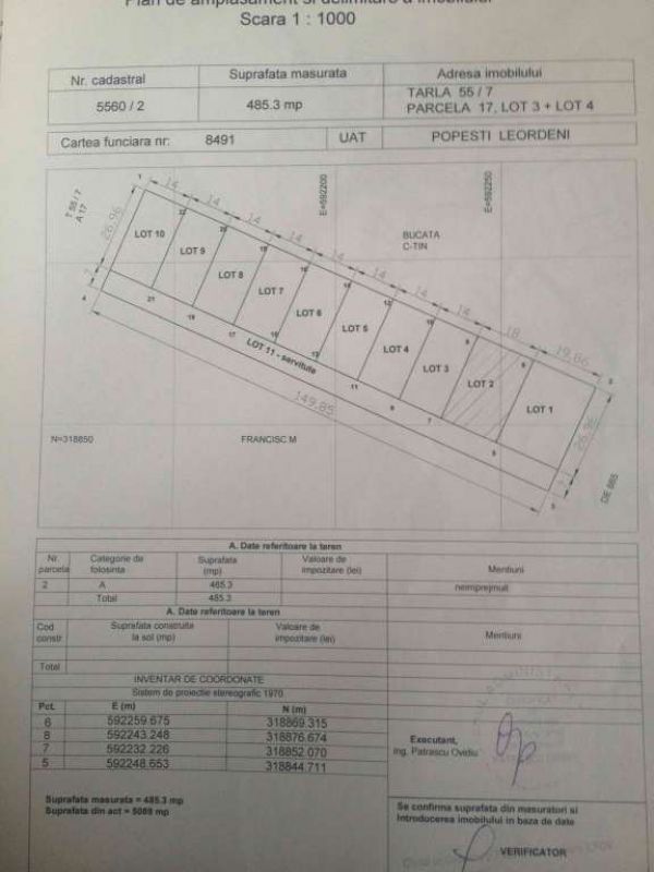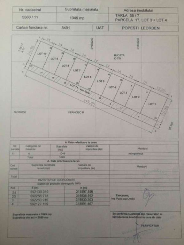 - Vand Teren intravilan in Popesti Leordeni, pe strada Miraslau in suprafata totala de 1285mp, lotul 2 are 611 mp - 18x33,96 si lotul 1 are 674 mp -19.86x33,96 intravilan. Pretul este de 58,5 Euro/ mp negociabil. Terenul este parcelat, are cadastru si intabulare , dubla deschidere la strada Miraslau si la aleea de servitute si utilitati in apropiere. Drumul de servitute are o latime de 7m.