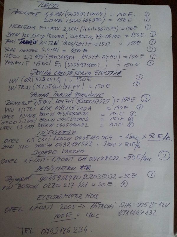 - Vand turbine pentru Peugeot 1,4 hdi, 2,0 hdi, Mercedes E-class 2,2hdi, Bmw320 d, E46, Ford Tranzit 2,0 tdci, Ford Mondeo 2,0 tddi, Iveco 2,3 hpi, Renault 1,5 dci; Pompe de inalta presiune pentru Renault 1,5 dci, VW 1,9 tdi, Opel 1,9 dth, Iveco 2,3 hpi, Opel 1,3 cdti; Pompa servo electrica pentru VW TRW; Injectoare Bmw E46 diesel; Supape vacuum Opel 1,7 cdti; Debitmetre aer; electromotor nou Opel 1,7 cdti. Pret 150 euro buc Contact: 0752186234, mario01nik@yahoo.com