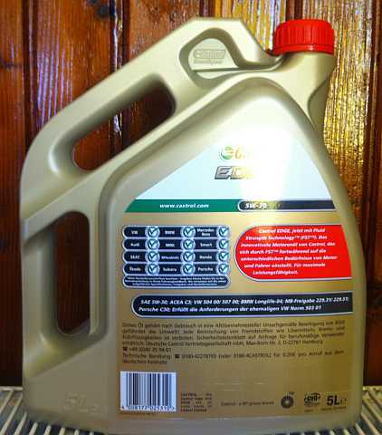 - Specificatii/ Aprobari: VW 504 00/507 00,503 01 MB 229.51, 229.51 BMW LL04 PORSCHE C 30 Formula complet sintetica cu Fluid Strenght Technology face parte din cea mai noua si elaborata gama de uleiuri recomandat pentru auto VW, AUDI, SEAT SKODA. BMW, Acest ulei de motor Castrol EDGE FST 5W-30 este indicat pentru toate motoarele de generatie noua TDI, FSI, motoarele turbocharged precum si pentru marea majoritate a generatiilor anterioare de motoare. Ambalat: bidon 5 litri Pret: 180 lei / bidon ( 36 lei / litrul !) Produs IMPORTAT din GERMANIA. (Atestat prin filigran). Contact: 0741936798, ulei_germania@yahoo.com
