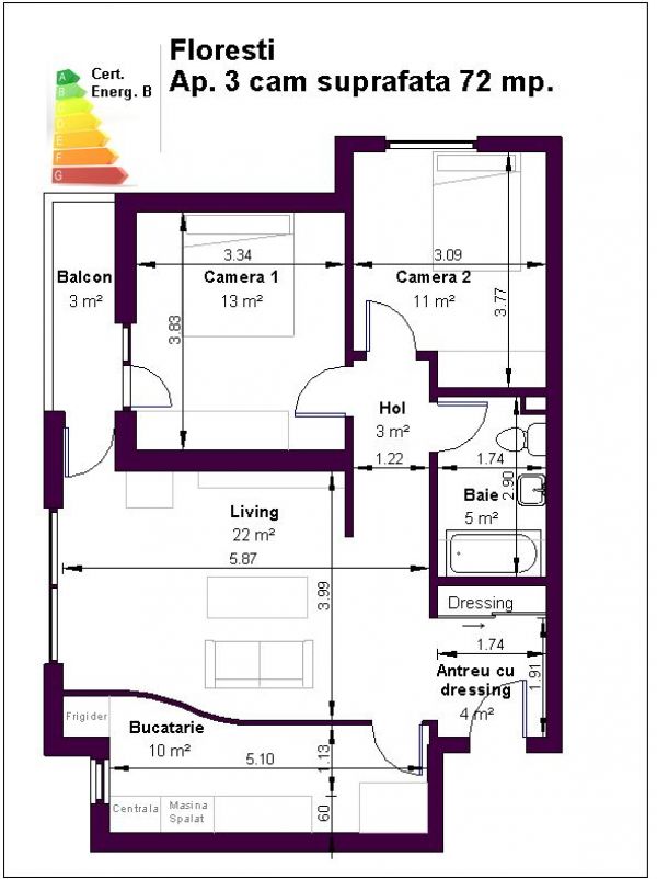 Suprafata 72 mp decomandat: living, bucatarie separata, 2 camere mari, baie, hol, balcon de 3 mp, bine compartimentat.