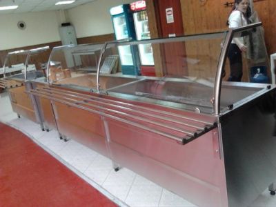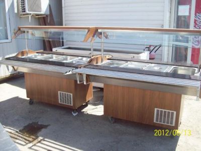 Vand line autoservire cu loc pentru impinge tava formata din o bucata masa rece cu dulap cu lemn si o bucata masa calda cu dulap lemn dim:140x85 cm , pret 2200 Euro.