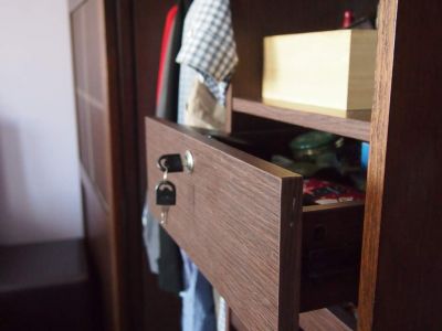 Vand sifonier Elvila, usi glisabile, sertar cu cheie, doua sertare deschise, spatiu cu bare destinat pantalonilor, doua spatii cu bare pentru umerase, led cu senzor de miscare in partea stanga a sifonierlui.