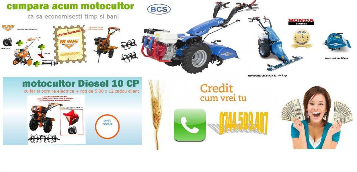 - Vindem motocultoare la preturi accesibile.Finantam produsele vandute pe www.motocultorieftin.ro. in 12-72 luni! Creditele oferite sunt acordate rapid si facil in orice judet al tarii. Se pot acorda la tineri fermieri,salariati si pensionari. Oferim suport tehnic si logistic in alegerea motocultorului dorit in functie de necesitatile fiecaruia. Produsele beneficiaza de garantie 24 luni si se ofera piese de schimb post garantie.Profita si tu de ocazie: 0744.509.407 Andrei. Site: www.motocultorieftin.ro