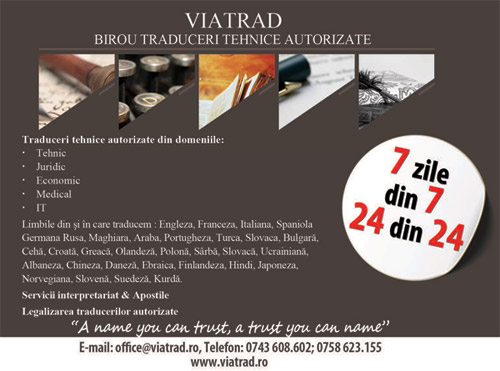 VIATRAD - Efectuam traduceri tehnice autorizate in orice limba de circulatie internationala din domeniile: Domeniul tehnic: manuale de utilizare, caiete de sarcini, procese verbale, licente, instructiuni tehnice, procese tehnologice, brosuri, instructiuni de intretinere; Domeniul juridic: legislatie europeana, contracte comerciale, norme europene, acte constitutive, etc. Domeniul economic: acte ale societatii comerciale, bilanturi, balante, dosare de participare la licitatii, Domeniul medical; Domeniul IT: programe software, website-uri, proiecte software, manuale de utilizare.
