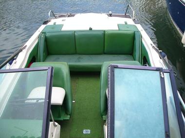 Vind salupa GLASTROM cu peridoc o axa inmatriculate 7 locuri din care 4 fotolii rabatabile umbrar prelata volan cu aparatura de bord visla veste de salvare opritori mal scara de coborire radio CD pompa apa ETC